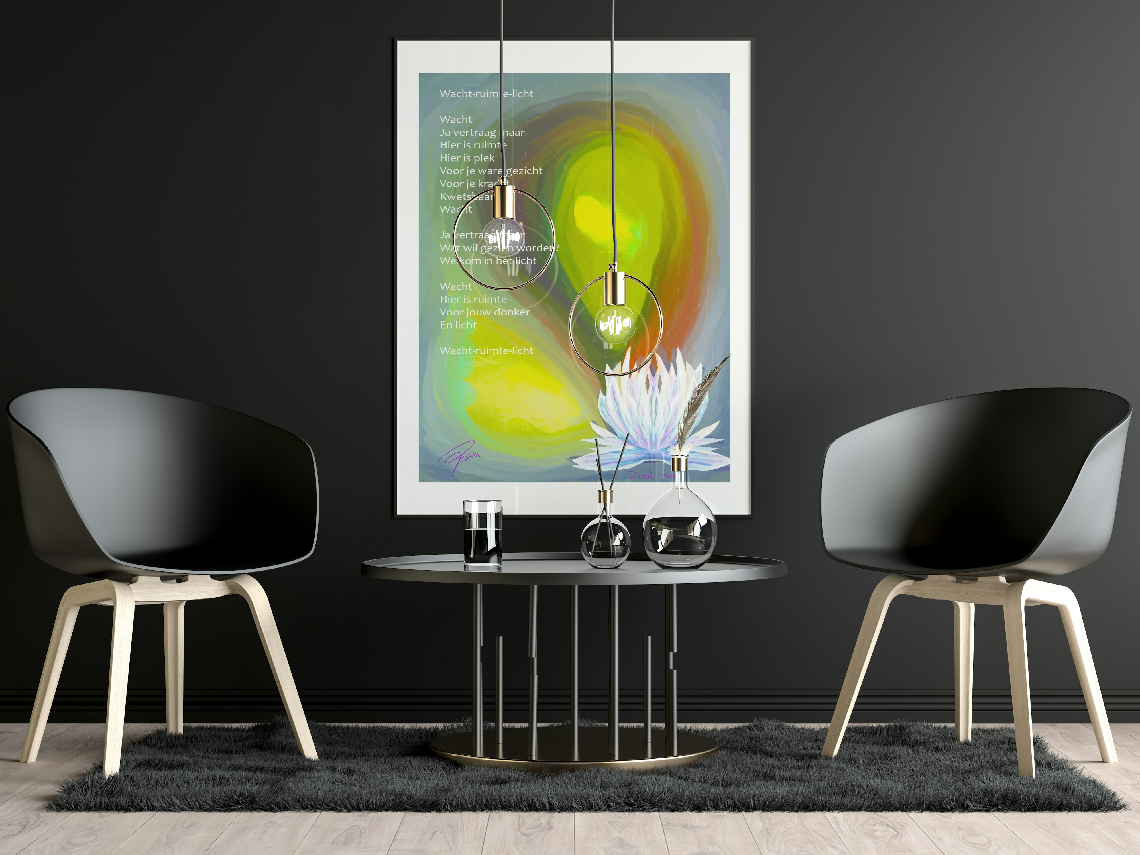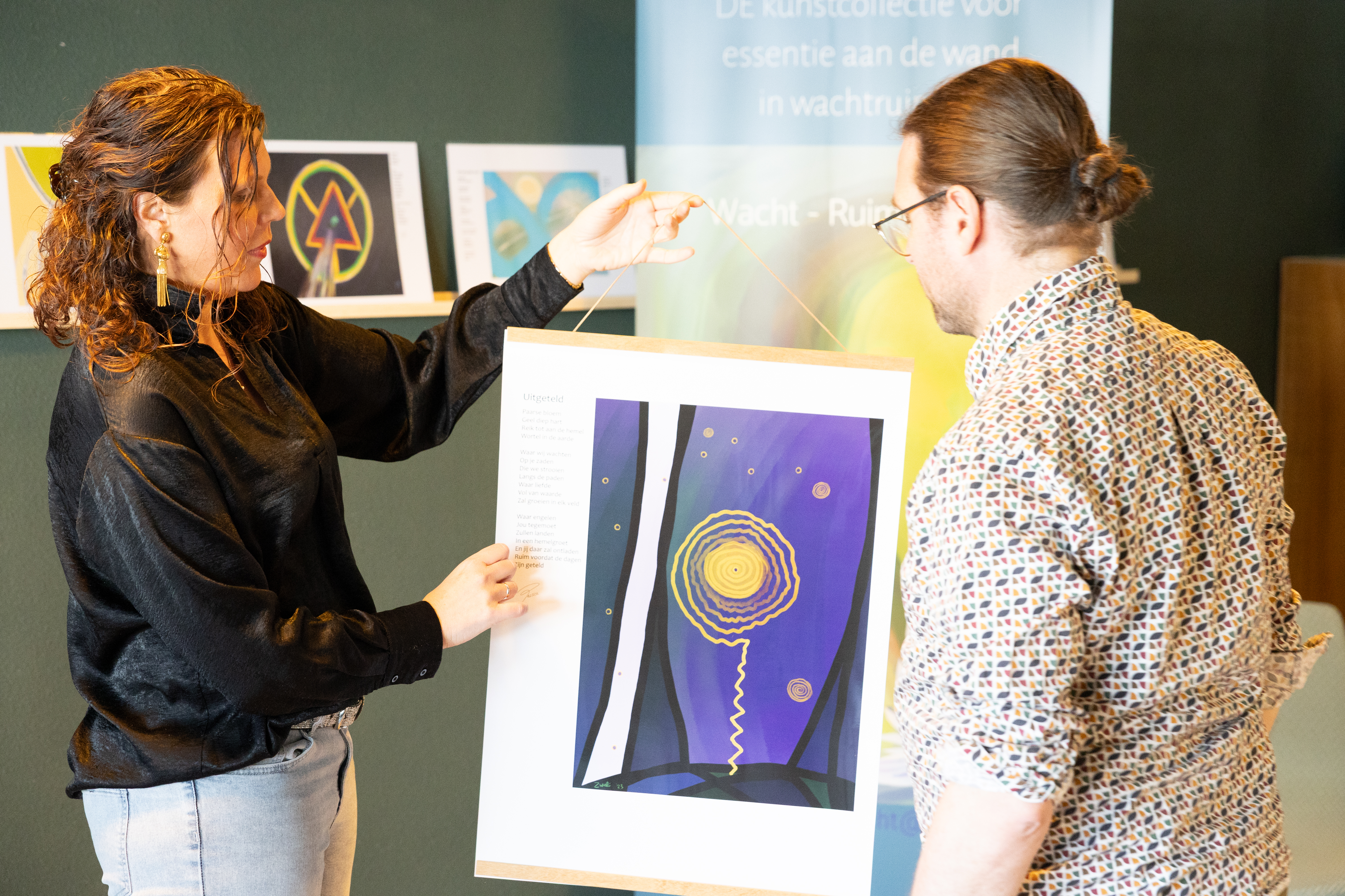 Op basis van onze eigen en andermans herstelprocessen ontstond onze kunstcollectie Wacht-Ruimte-Licht. Het vult wachtruimtes met hoop, perspectief en inspiratie. Het biedt een gevoel van omhulling tijdens het wachten op een afspraak, zodat er straks met meer essentie aan herstel gewerkt kan worden.